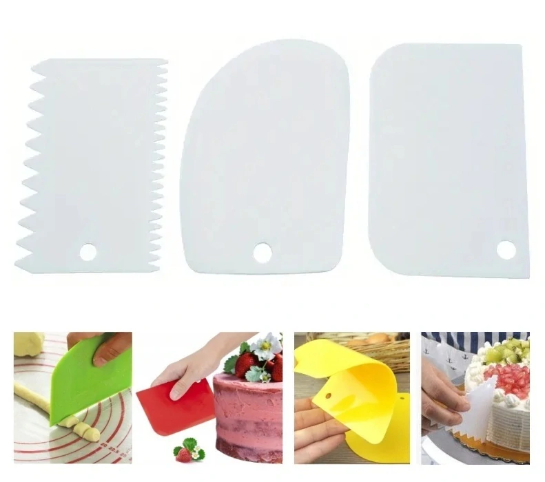 Sada tří plastových stěrek různých tvarů je určena pro tvarování krému a vytváření cukrářských ozdob na dorty a jiné pečivo. Jsou ideální pro roztírání, tvarování, vyhlazování a vytváření vzorů v polevě, krému, husté smetaně a cukrové pastě. Lze je použít na čištění misek, hlazení polevy apod. Lze je použít i jako nástroj pro odstranění přebytečného těsta nebo mouky z pracovní plochy.