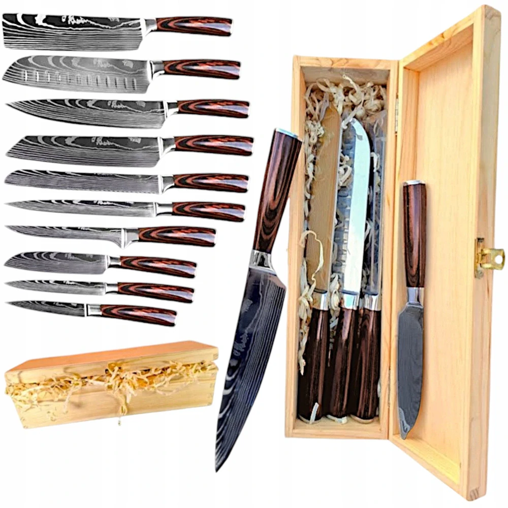 - Profesionální japonské kuchyňské nože 10 ks z nerezové oceli s imitací damaškové oceli v dřevěné kazetě