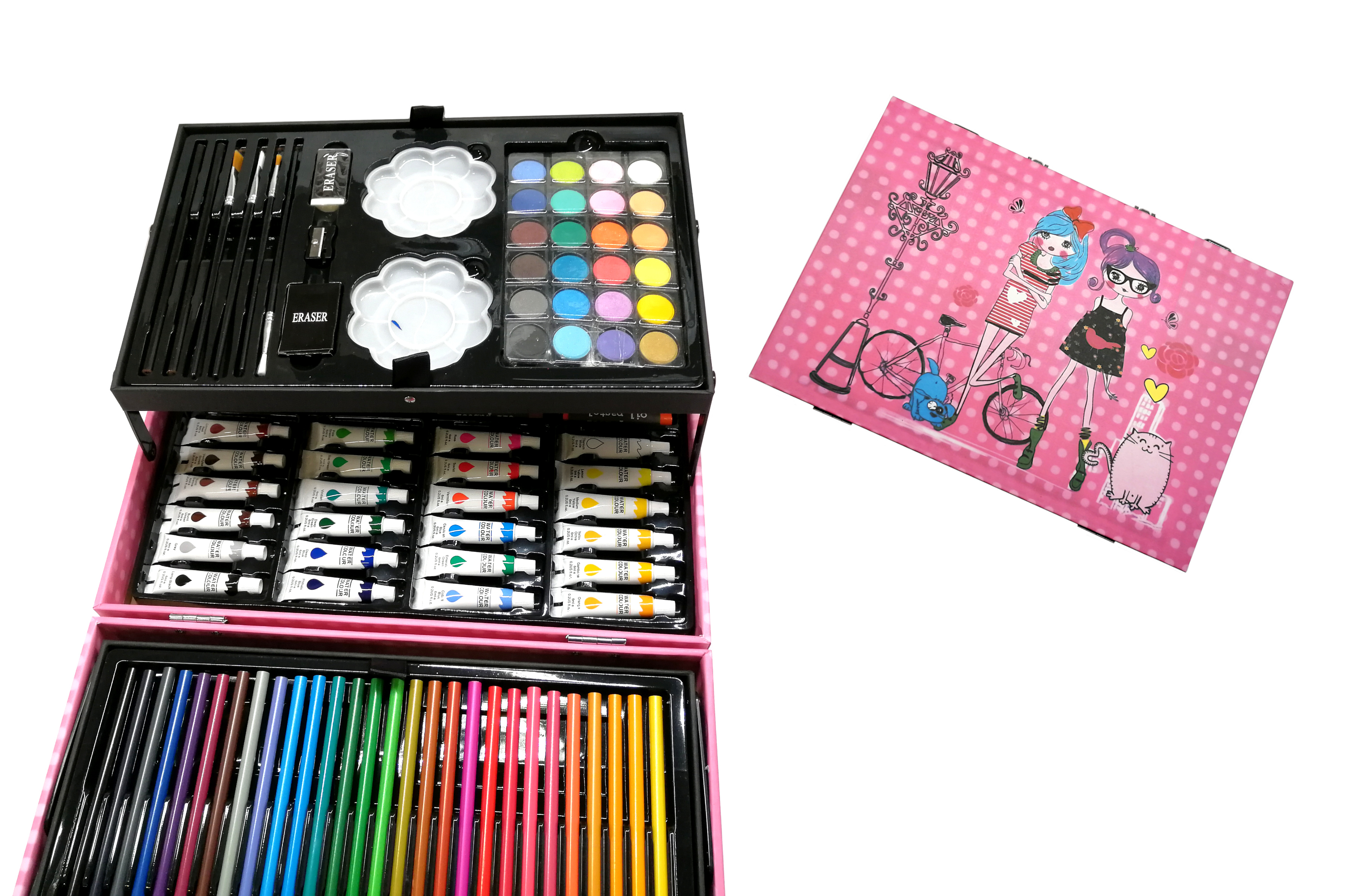 Kompletní velká sada 145 ks potřeb pro malé malíře. Jedná se hezký dárek na malování pro dítě k narozeninám, k svátku nebo k Vánocům, ať už pro holčiku nebo chlapečka, jenž si rád kreslí a maluje.
